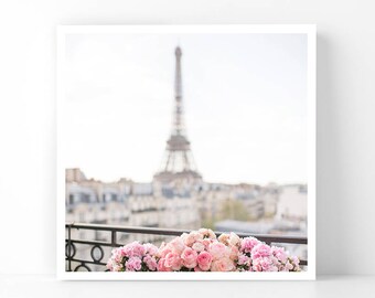Paris Photography - Rose Filled Balcony with the Eiffel Tower, 5x5 Paris Fine Art Photograph, French Home Decor, Wall Art, Gallery Wall