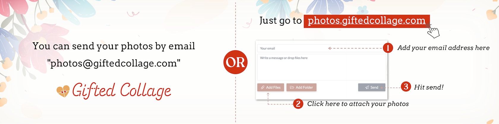You can email your photos at our email ▶ photos [!at] giftedcollage.com