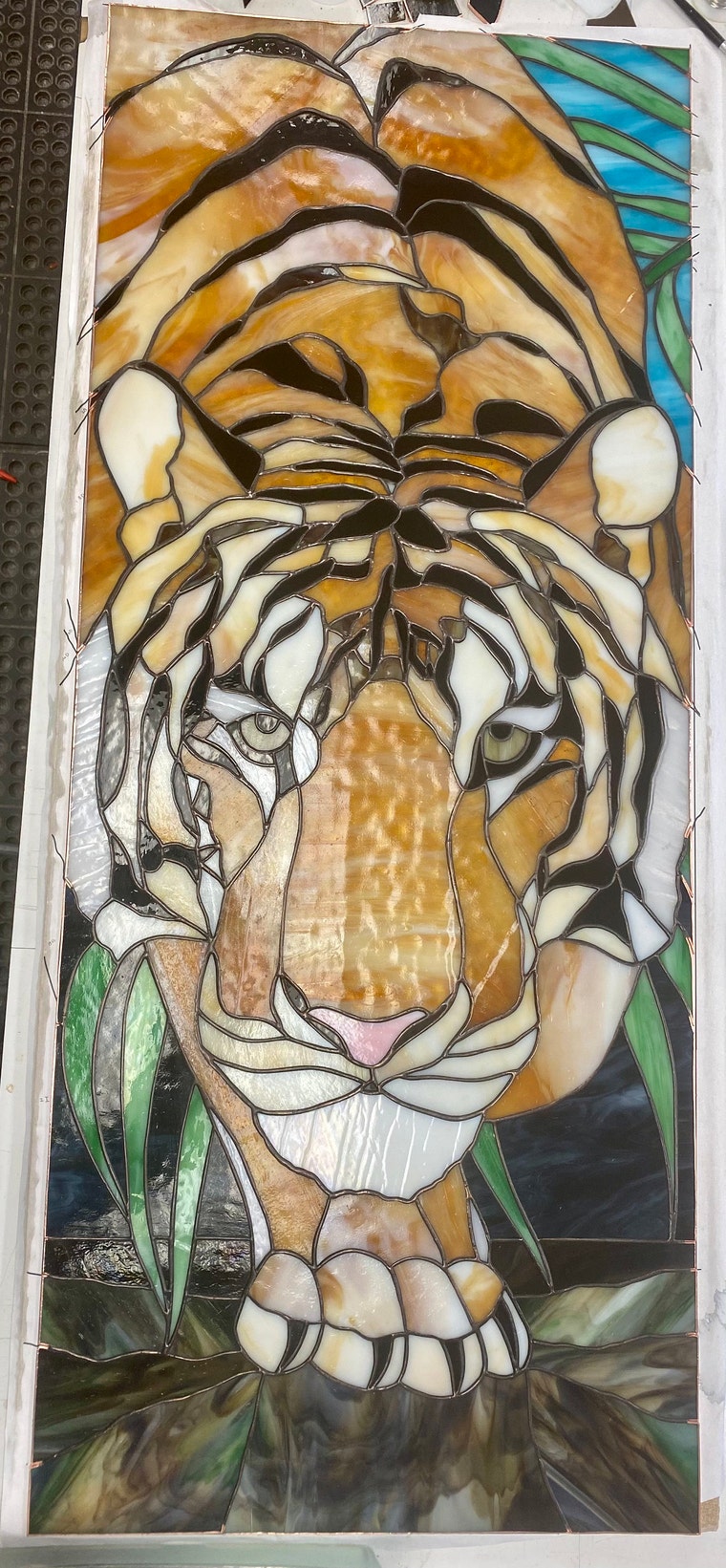 Each cut piece of glass is then ground to fit precisely within the pattern. We pay careful attention to every detail. -