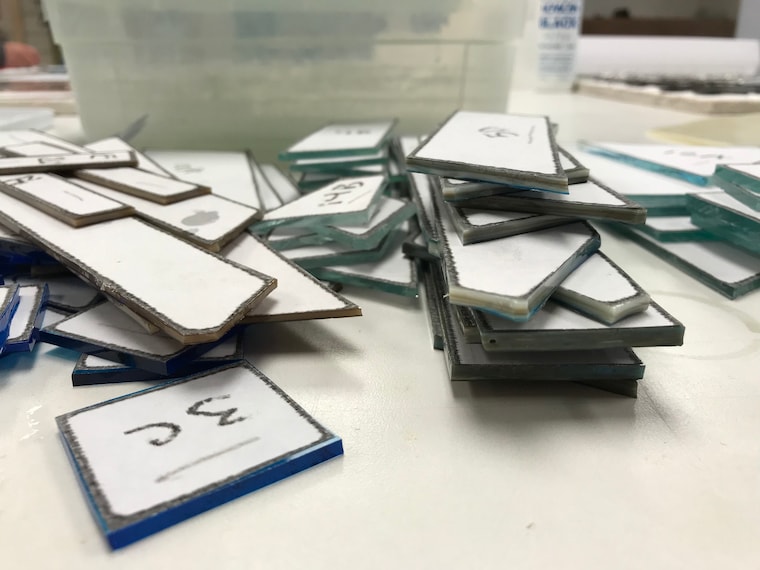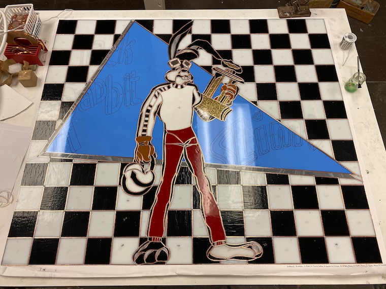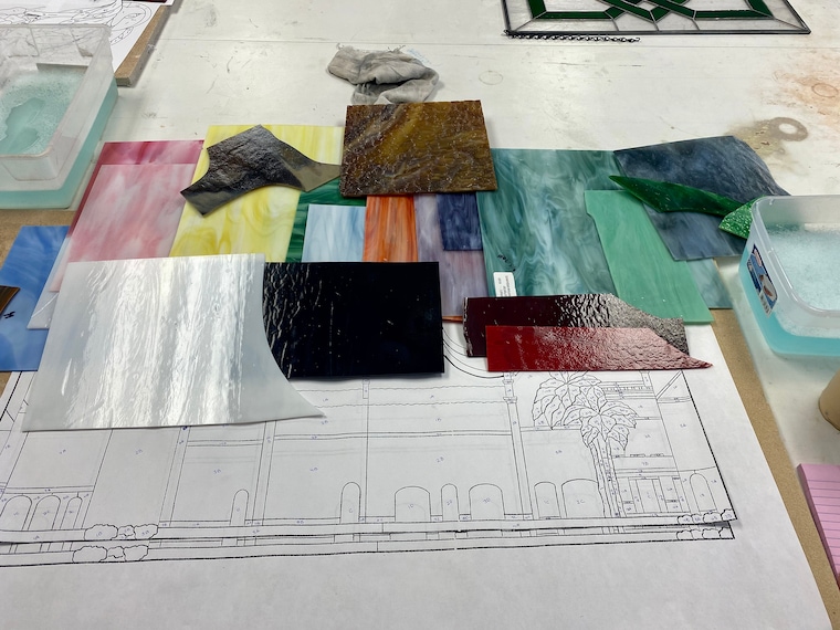 After the glass is chosen for your project, every piece is hand cut in the studio.