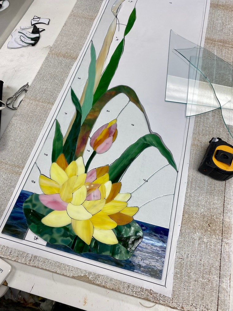 We create a pattern and carefully choose each piece of glass for your project based on color and movement. -