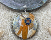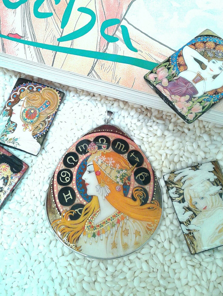 Hand painted painted Mucha silver pendant designed by Global Curiosity. -