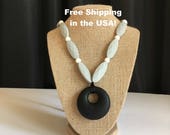 5 out of 5 starsThis simple necklace is just what I was looking for. I’m not big on BIG, bulky jewelry. This was neutral and simple, and perfect for my little guy to play with and gnaw on. I also like that there’s no easy-release clasp so he can’t jerk it off of my neck. And of course the length is adjustable.