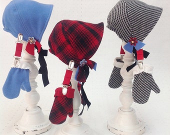 Baby girl bonnet, wooly bonnet, vintage re-purposef woolens, soft cotton lining, wool baby mittens, bonnet and mitten set, black white check