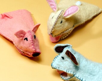 Hand-stitched felt hand puppet, Pig or Bunny, They are fun, made of soft felt. A pink pig or yellow bunny.
