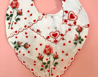 Valentine's Day Handkerchief Bib for Baby! Red Hearts and Pink Roses, Vintage Handkerchiefs