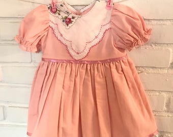 Sweet, Pink baby toddler dress, vintage hankies adorn the top and a pink satin ribbon sash. Size 6-12mos.