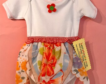 A sweet Baby girl onesie with a vintage hanky skirt, pretty orange flowers and bows, baby one piece, instant dress up!