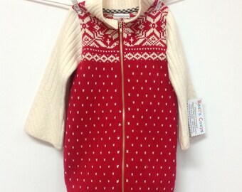 This handmade sweater for your toddler is red and white made from recycled sweaters, 12-18 mos size, a snowflake motif, warm wooly sleeves