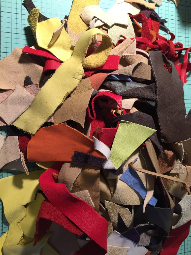 Leather is the main ingredient in my pins. Here's a pile of scraps after making roughly 40 pins. -