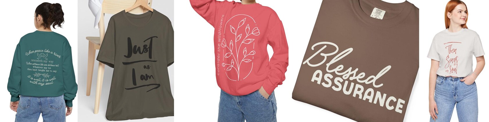 When I was little my mom would sing hymns as she rocked me to sleep. Hymns were sung each time we sat in the pew at church. Over the years, they became a place of comfort and peace. Years ago I started wearing t-shirts that shared a Christian message, whether a verse or a line in a hymn. It's such a simple way to share the love of Jesus. I decided to use my design background to make shirts of my own. I love when I meet someone who looks at my shirt, and says "I love that song!" It's a way to connect to others, encourage others and share Jesus, while you carry a reminder of the peace that He gives.