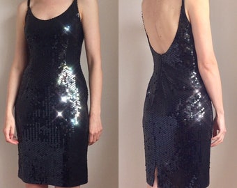 True Vintage 80s Dress/ 1980s Black Sequin Dress/ Wiggle/ Cocktail/ Backless/ Glitter/ Disco/ Party/ Mini Dress/ Sparkle/ Medium