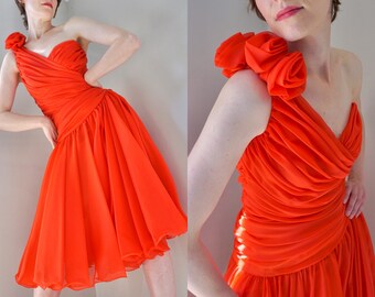 Vintage 1980’s Red Dress/ 80’s One shouldered Cocktail/ Ruched/ Draped/ Roses/ Flowers/ Sweetheart/ Frank Usher/ Chiffon/ Flutter/ Medium