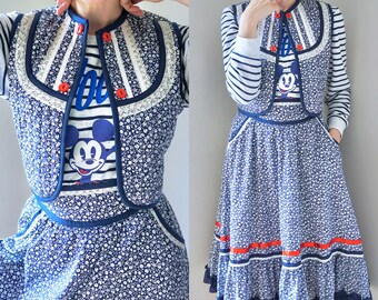Vintage 1970s 2 Piece/ 70s Prairie matching set/ Skirt/ Vest/ Navy floral ditsy/ quilted/ Frill/ Ruffle/ Folk/ Boho/ Peasant/ Tiered/ small