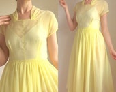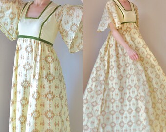 Vintage 1970’s Dress/ 70’s yellow Floral Prairie/ Maxi/ Long/ Flutter/ Empire/ Boho/ Bib/ Angel Sleeves/ little women/ small