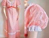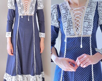 Vintage 1970s Gunne Sax Dress/ 70s Prairie/ Jessica McClintock/ Black label/ Polka dot/ Lace/ Puff shoulders/ corset/ Midi/ Tiered/ small