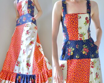 Vintage 1970s Dress/ 70s Patchwork Maxi/ Apron/ Criss Cross/ Boho/ Pinafore/ Peasant/ Floral/ Ditsy/ Ruffle/ Pockets/ Small
