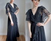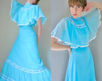 Vintage 1970’s Maxi/ 70’s Turquoise Prairie/ Caplet/ Cape Collar/ Shawl Collar/ Tiered/ Ruffle/ Frill/ Blue/ Peasant/ Hippie/ Cottage/ XS