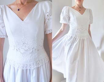Vintage 1980s White Dress/ 80s Cut Out Linen Cotton Midi/ Puff Sleeves/ Lace/ Crochet/ Marie.St.Claire/ Embroidered/ Cottage Core/ Small