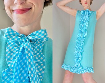 Vintage 1960s Shift dress/ 60s Turquoise mini/ Gingham/ Ruffle/ Frill/ Sheath/ MOD/ Checked/ Linen/ Summer/ small