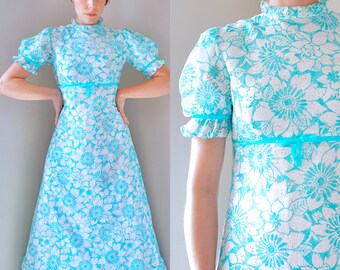Vintage 1970’s Dress/ 70s Lace Maxi/ white/ Turquoise/ Floral/ Retro Print/ Prairie/ Ruffle/ Frill/ Puff Sleeve/ Empire/ Little women/ Small