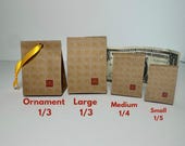 Because each mini bag is a replica of the original, exact size varies, which is why we offer 3 sizing options all at the same price! Most of the time the 1/3 size Large mini bag is close to 2 1/2" wide, the 1/4 size Medium is approximately 2" wide and the 1/5 size Small mini bag is about 1 1/2" wide. Some bags are tall and skinny, and we do our best to disclose which ones have an odd shape.
