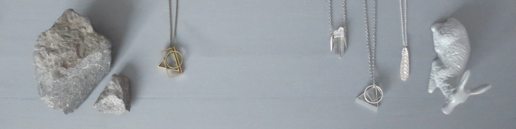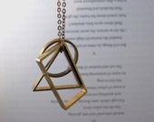 My long geometric brass necklace with its rectangle, circle and triangle elements (photo credit: Orchid Grey blog) -