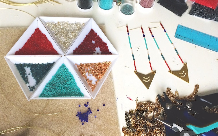 One of my color-rich brass geometric styles, the Kauai necklace, in process of creation -
