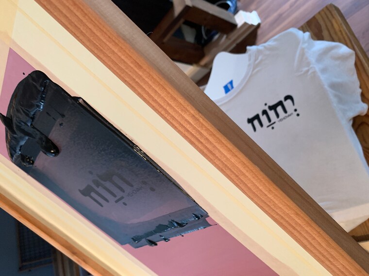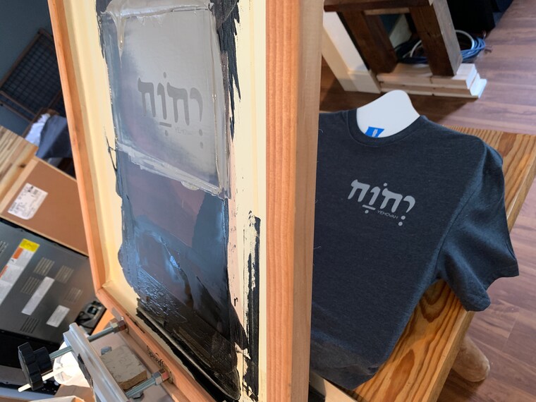 YHVH's T-shirt on the platton! :-) We have a simple one-color screen printing press. -