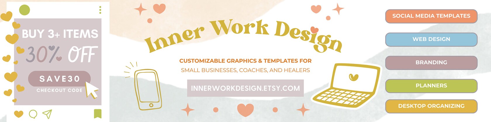 My goal is to ease your worries and help your business thrive by doing the design deep work for you by offering templates and designs focused on small businesses, coaches, and healers.