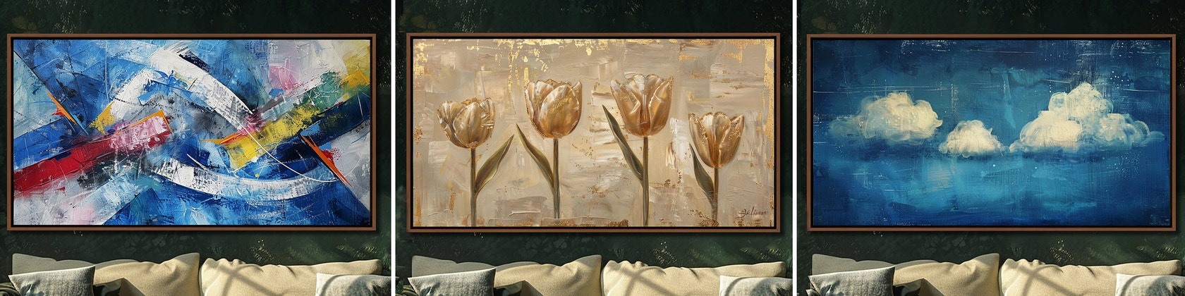 5 out of 5 starsWe love the pieces, they look fabulous in our space. Disappointed in how they were shipped (not wrapped), just placed in a box. All the boxes were damaged during shipping but only one sustained a tear in the canvas. The seller was extremely helpful and resent the panel that was damaged. The resent panel was received thank goodness in good condition even though the box was damaged during shipping. I would only suggest to seller to wrap the art or even adding cardboard around the canvas. I would still highly recommend. Love these pieces