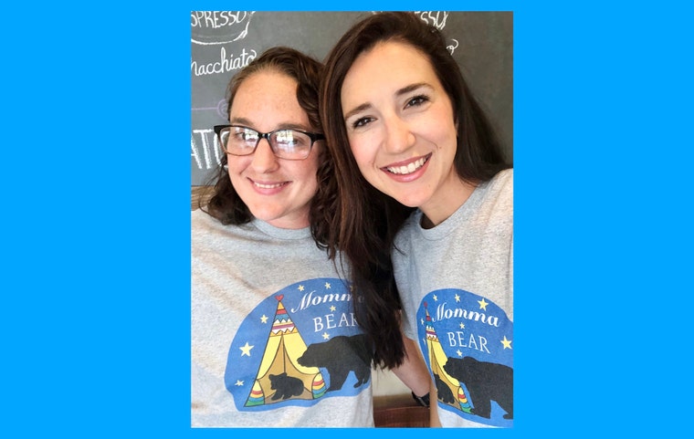 At our favorite local coffee shop enjoying “bestie time” and proudly wearing our Momma Bear Shirts 🥰🤎 -