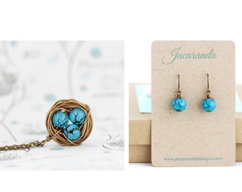 Bird Nest Jewelry Gift Set - Holiday Gift Idea - Woodland Jewelry - Bird Jewelry - Turquoise Jewelry - Turquoise Bird Nest