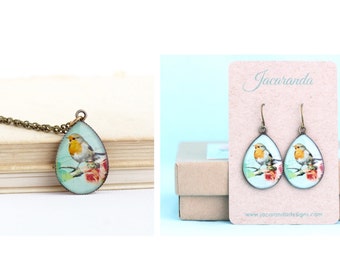 Woodland Jewelry - Gift Set - Bird Jewelry - Robin Red Breast - Necklace and Earrings - Gift For her - Nature Necklace - Nature Earrings