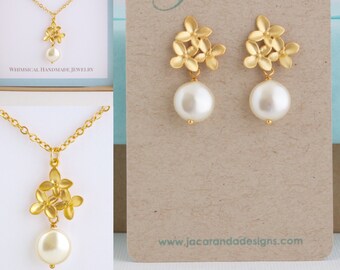 Bridal Earrings and Necklace Set - Pearl Necklace Earrings Set - Pearl Gift Set - Wedding Gift Set - Gold Flower Jewelry - Gift For Woman