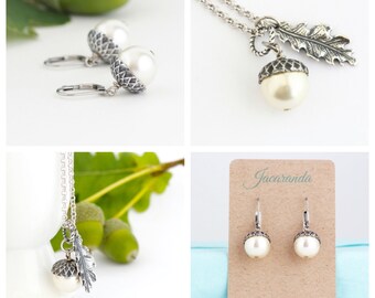 Woodland Wedding Jewelry - Acorn Jewelry Gift Set - Gift For Her - Silver Earrings Necklace - Bronze Pearl Acorn - Rustic Jewelry