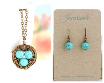Gift For Mother - Bird Nest Necklace - Woodland Jewelry - Jewelry Gift Set - Mommy Gift - Bird Nest Necklace - Turquoise Necklace