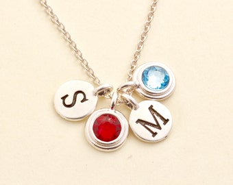 Silver Birthstone Initial Necklace - Family Necklace - Gifts For Her - Personalized Monogram Necklace - Gift For Daughter