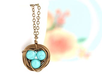 Mothers Necklace - Turquoise Bird Nest Necklace - Family Jewelry - Gift For Mother - Woodland Necklace - Mommy Jewelry