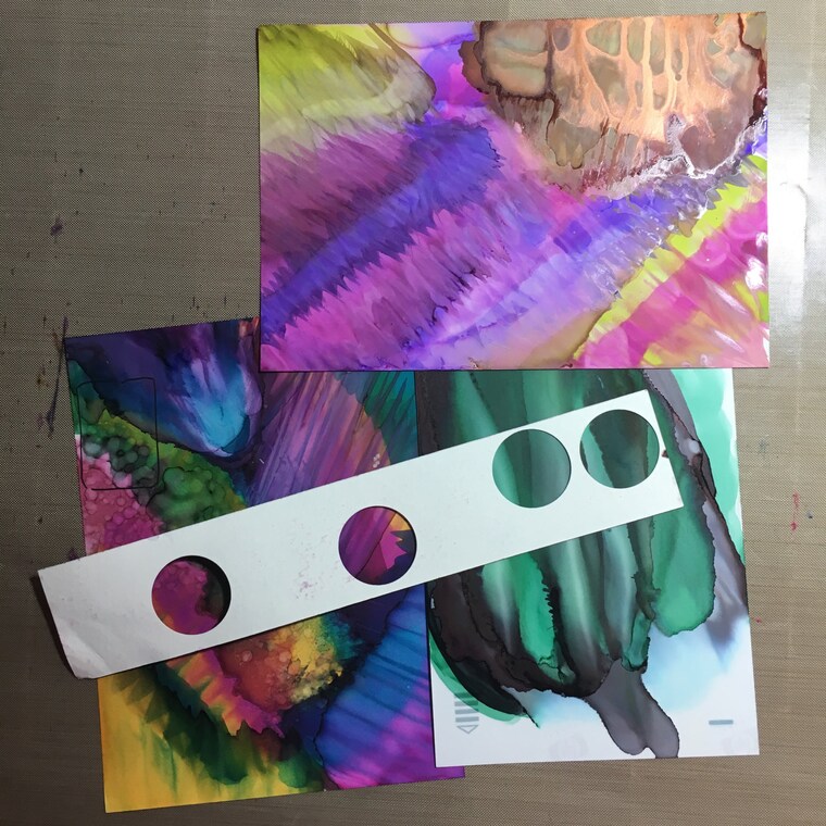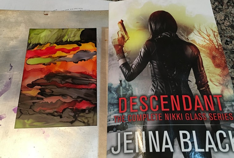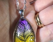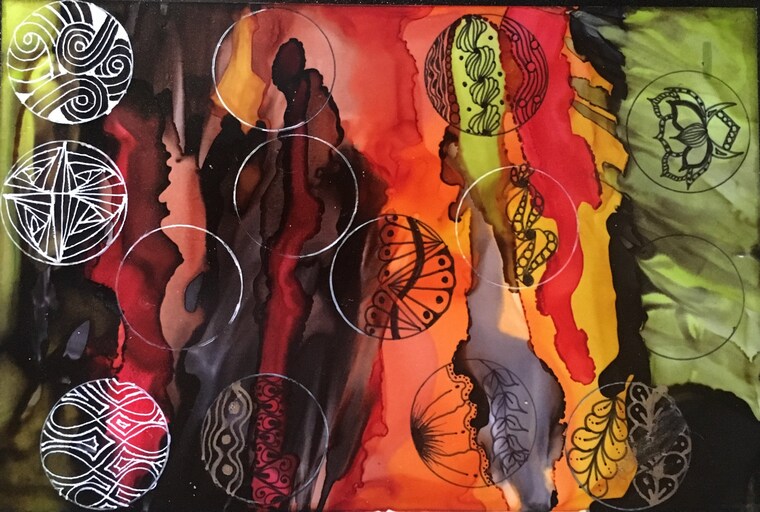 There are two basic kinds of pendants available in my shop: those that are based on pen and ink drawings, and those that were made using alcohol ink. (which may then include some pen and ink drawing as well). The alcohol ink lends super brilliant colors and combines to produce wonderful patterns. Working with alcohol ink is like watching a fireworks show, because you never truly know how the inks are going to interact with each other. I especially love working with alcohol inks on foil, which creates a luminous effect that I find just breathtaking.