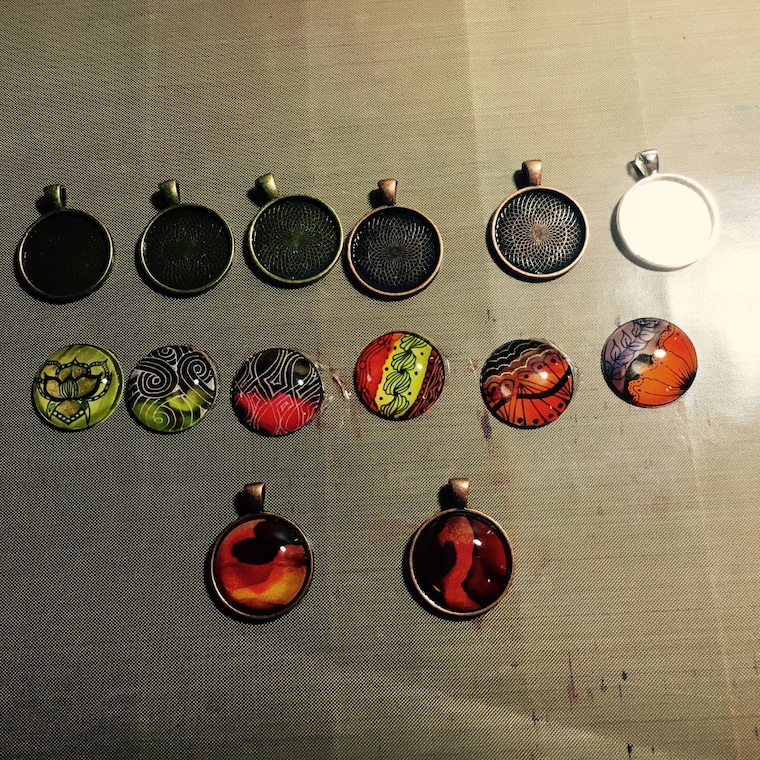 All pendants are individually handmade. Those with alcohol ink are sealed with two coats of varnish before I glue them. The settings are nickel free, so those with nickel allergies need not fear.