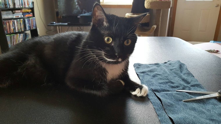 Huggy is helping me cut up blue jeans for a fun, new project! -