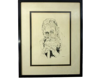 Judaica Art Signed J. Ernest Vintage Ink Portrait Rabbi Original Framed 1960s