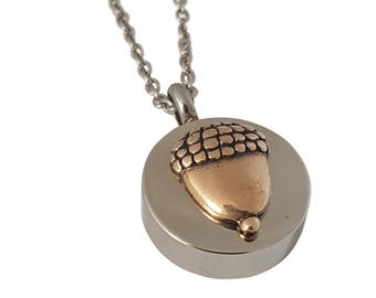 Circle Acorn Cremation Urn Memorial Capsule Pendant Necklace - Stainless Steel + Bronze Acorn - Custom Engraving Available - Keychain Option
