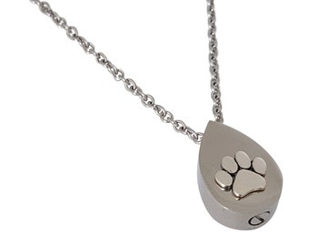 Silver Tear Drop Dog Paw Print Pet Cremation Urn Personalized Memorial Capsule Pendant Necklace - Custom Engraved Pet Loss Sympathy Gift