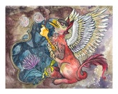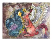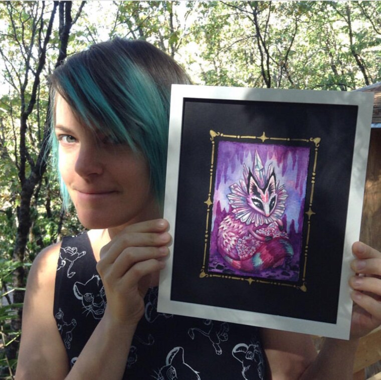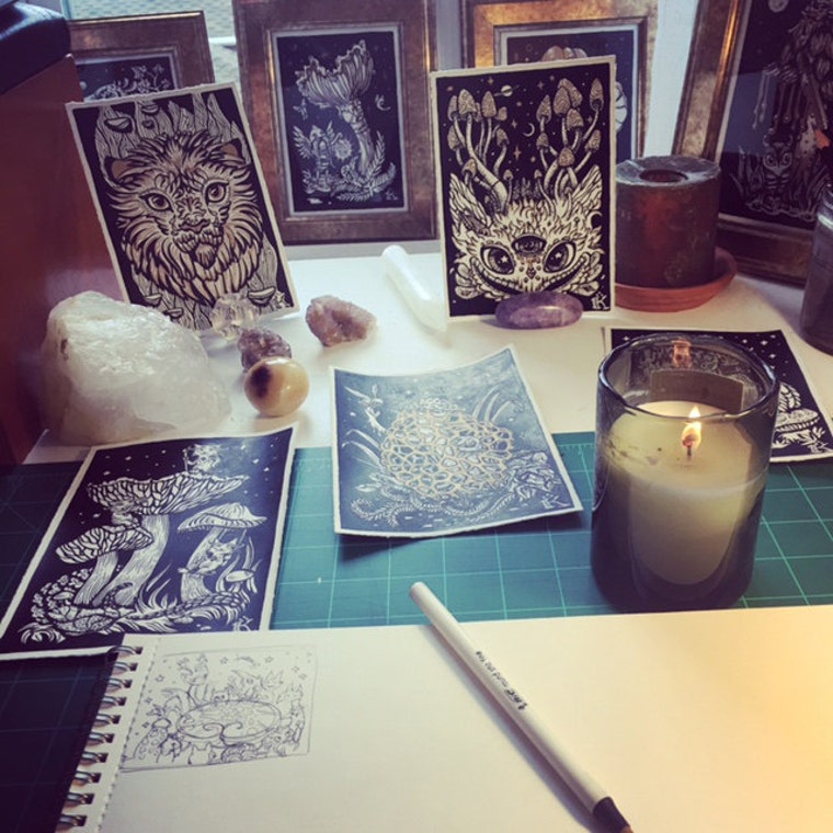 "Kelly makes her home among the rain forests of the great Northwest, and has traveled throughout Europe and lived simply in the woods, giving her art aesthetics of an otherworldly fairy tale. Her studies in symbolism and divination add mystical meaning to the stories in her pictures. She illustrates animals, her community and surroundings into her paintings with these themes as the backdrop."