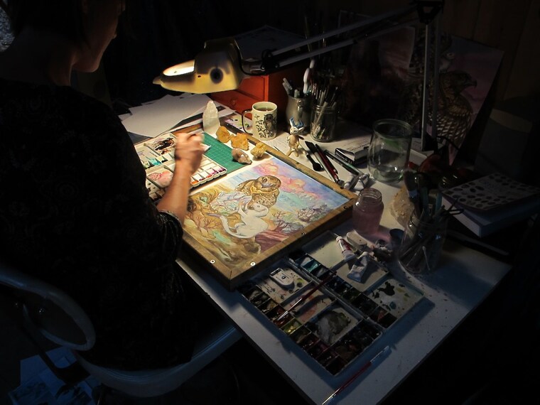 Expongo pinturas originales, creo encargos y escribo e ilustro libros. Mi primer libro ilustrado infantil autoeditado, titulado Moon Bunny, se publicó en marzo de 2015. Cuando no estoy pintando, escribiendo ni creando libros, me encanta componer y grabar mi propia música, y en mis pinturas encontrarás muchos personajes tocando instrumentos. Me encanta recorrer senderos de montaña y nadar en ríos, y viajar cuando tengo la oportunidad.