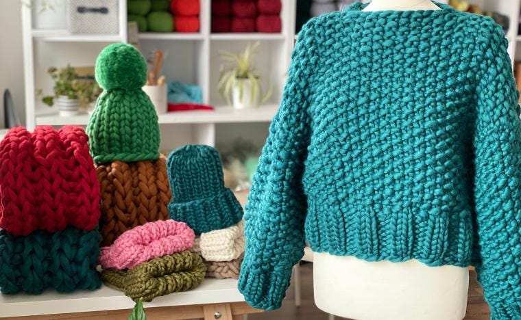 Best-selling beanies and oversized scarves, cozy blankets, cardigans, men’s essentials, plus beginner-friendly knitting kits and our signature yarns.