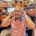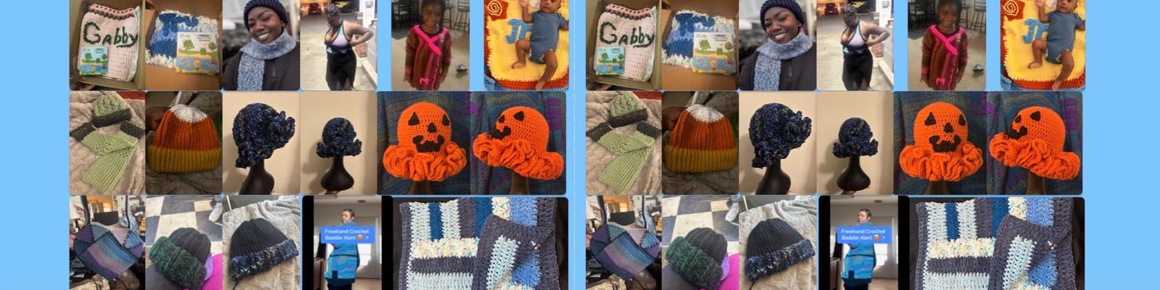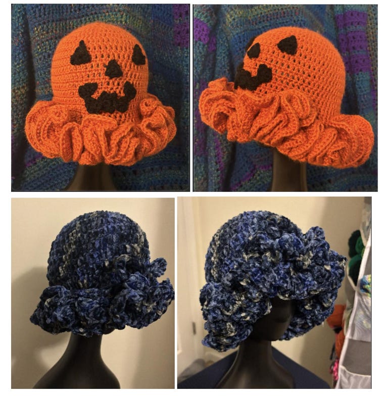 Crocheted bucket hats with large ruffles (ruffle size is adjustable). A jack-o-lantern and a velvet one with a bow -