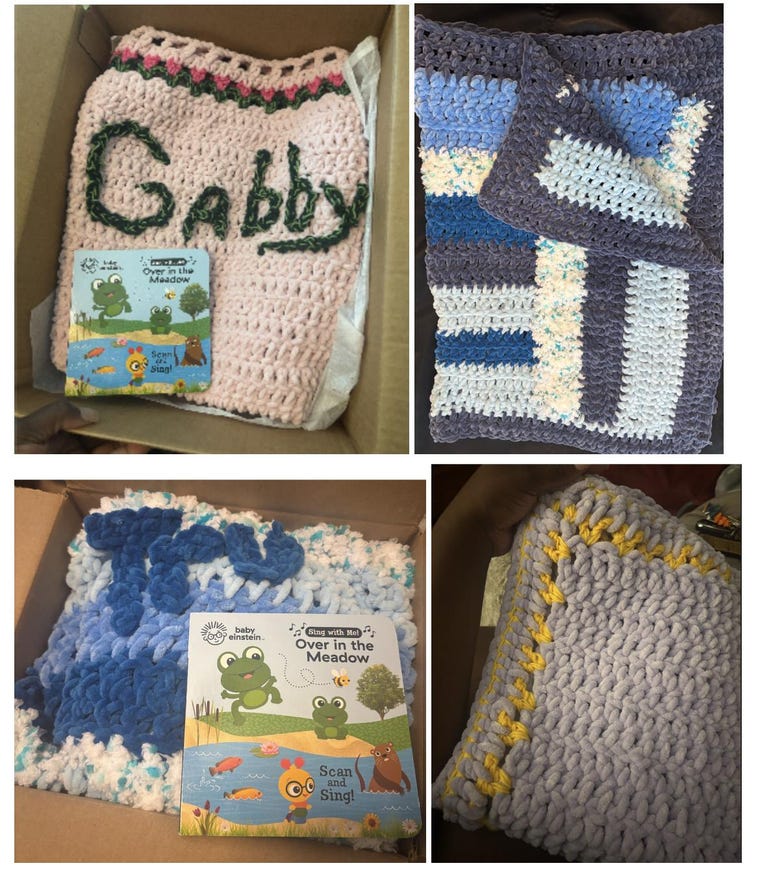 Crocheted baby blanket with hand-crafted appliques (the sun, the clouds, and the letters). -